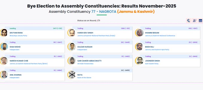 Jammu, Nov 14: In the first round of counting, the Bharatiya Janata Party (BJP) is ahead in the Nagrota Assembly segment by 1,111 votes.