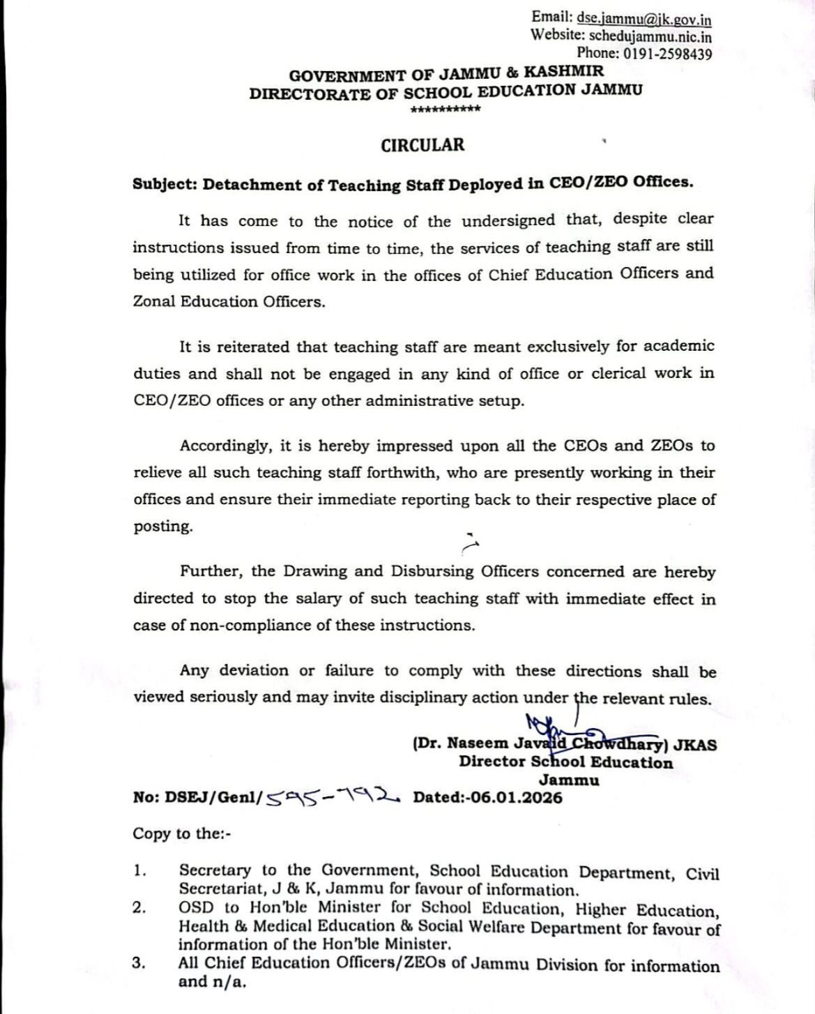 As per the circular issued by Director School Education Jammu, Dr. Naseem Javaid Chowdhary stated that, It has come to the notice of the undersigned that, despite clear instructions issued from time to time, the services of teaching staff are still being utilized for office work in the offices of Chief Education Officers and Zonal Education Officers.