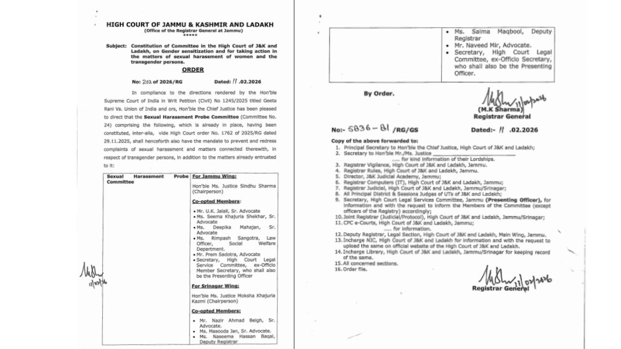 JAMMU, Feb 12: The High Court of Jammu & Kashmir and Ladakh has expanded the mandate of its Sexual Harassment Probe Committee to include complaints relating to transgender persons, in addition to matters concerning women.